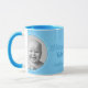 En söt blå baby firande mugg med söt koala, sitta på en presentlåda och vattenfärgsfärg för ballongfärg. Anpassa med ditt eget pojke namn och födelsedatum och två speciella foto. En underbar minnesgåva till ett nyfött baby. Ursprunglig konst och design av Sarah Trett för www.mylittleeden.com på zazzle.