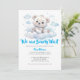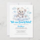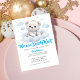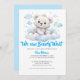 En elegant babyduschinbjudan med en söt björn unge som leker i skogen i vita moln