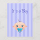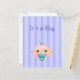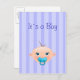 Ett vackert födelsemeddelande i blå skuggor, en söt pojke baby ansikte med nappar på en blå pastellbakgrund med strimlad bakgrund.