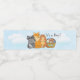 Cute fox, tvättbjörn och träskuck och baby leksak basket, på blåa och bruna skogslandskaps etikett för babyduschens vattenflaska.