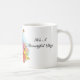 Det här kaffet mugg visas med en fin blomskrift med frasen "Det är en vacker dag". Anpassa det här objektet eller köp som det är. Lagrar-bild