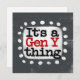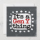 "Det är A Gen Y Sak" är en söt textdesign i grått med svart och röd text, tillsammans med en vit accentform och vita texturerade vita punkter runt den.