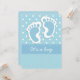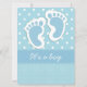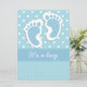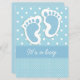 Denna baby showerinbjudan presenterar en design av två baby med hjärtfelfotspår, på en omväxlande blått, och vitpolkaen pricker bakgrund. Centreraranden har att sy specificerar, och anpassadet "är det text för en pojke". Blåttbakgrunden på baksidaen och informativ text, kan skräddarsy som önskade.