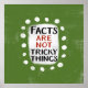 Fet text som läser "Fakta är inte svårt Sak" centreras mot gröntens bakgrund. Den svarta och mörk orangen sitter på en vit rektangel med stora texturerade vita prickar runt den, vilket ger en lekfull kontrast mot den heltäckande färg-bakgrunden.