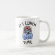 Vilken tid är lunch? Det är lunchdags. Rolig rolig hund vid bordet redo för lunch. En perfekt matchning för barn såväl som för vuxna.