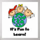 Tre barn i stick figur omger en global värld och texten lyder "Det är Roligt att lära sig!" på skolmatade T-tröjor, kort, mugg, klistermärken, knappar och andra redskap!