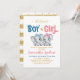 Det är tvillingar. Bedårande illustration av en vacker bebis elefant med ett rosa band ovanför huvudet och en annan bedårande bebis elefant med ett blått band ovanför huvudet. Vattenfärg målning stil. Baksidan har en bakgrund med guld och vita ränder och gyllene glitter prickar.