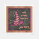 En roligt fyrkantig party-cocktailnapkin med en flytande rosa och orange-förtrollad häxhatt som säger "Det är årstid, Låt oss Party" på en mörk träkolsvart bakgrund med rosa gräns. All text är redigerbar.