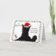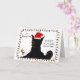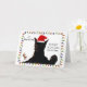 Roligt julkort med en söt svart katt som bär en tomtehatt och gör en rolig min med hälsningen "Det börjar lukta mycket jul".