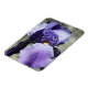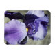 Ett foto av en ny lila blommar av Iris-blomman. Bakgrunden är en boulder i trädgården.
