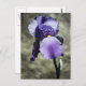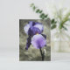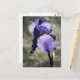 Ett foto av en ny lila blommar av Iris-blomman. Bakgrunden är en boulder i trädgården.