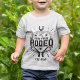 Roligt, stil typografiemblem i cowboyen har titeln "Ja, det här är söt mycket min FÖRSTA RODEO." Emblem accentueras med ljusstrålar, stjärnor och hästskosikon. I ord kan "min" ersättas med ett namn eller ord efter eget val, och stjärnor bredvid den översta titeln kan tas bort. Baksidan har hästskon med redigerbar text nedan, "YEEEEE-HAAWW! Underbar gåva till vilken ung cowboystjärna eller cowgirl-rodeo-stjärna som helst i ditt liv!