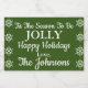 Perfektens julhelg för mini-vin-etiketten med texten "Tis the Season to be Jolly Glad helg Kärlek _____________" i klassisk färg av grönt och vit med traditionell snöflingdesign som ska anpassas med ditt efternamn