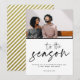 Julkort för det moderna paret i vårt svarta typsnitt "Tis the säsongen" med ett foto. På framsidan av detta julkort finns ditt foto, meddelande och namn. Kortet återgår till ett festivt guld och vitt diagonalt rand.