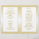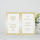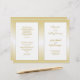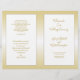 Mall för det katolska bröllopsprogrammet med guld-övertoningsbakgrund, tryckt på pappra linne. Det här programmet med ett lager innehåller fyra sidor att anpassa. Helvita paneler innehåller texten från guld färg, som har ett modernt utseende av kombinerat handskrivet skript och tryckt typsnitt. På varje sida finns det utrymme för mycket text för att passa in en ceremoni. På sista sidan (baksidan av programmet när det viks) finns ett avsnitt för skript (provet är "Kärlek är patient, kärlek är snäll" från 1 korintianer) och ett meddelande från bruden och brudgummen. Program har pappra alternativ och måste vikas efter köpet.