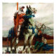En riddare som är monterad på en häst står bredvid en flod och håller en lans med ett tankfullt uttryck. Nästan två personer sitter på marken och tittar upp på natten med oro eller rädsla. Den här målningen heter "The Coming Lancaster" av Howard Pyle.