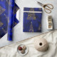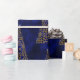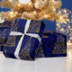 Ett contemporary blått och guld julomslag med ett glansigt mönster av guld, metalliskt Julgranar tillverkat av snöflingor, i ett mycket modernt, minimalistiskt stil. De är spridda över en mönster av mörk blått (faux) silke. Den här eleganten kommer julklappen säkert att ge en lyxig bild av alla gåvor till julhelgen.