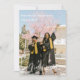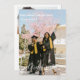 Inbjudningskort för Photo Twillingar studenten eller dubbla studentfest. Två foto från student visas på vykortsinbjudan för elegant grad party. Gradens namn, skola och klassår skrivs i avslappnad med ett modernt svart skript på baksidan.