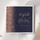 Den lämnat kant i denna elegant moderna bröllop-servetter har en ro faux glitter-design. Anpassadet kombinerar handskrift och typsnitt i blek ro färgad över ett stort område på en mörk blått bakgrund.