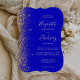 Den lämnat kant i eleganten är en modern bröllopsinbjudan i form av trendig-fästen och har en guld faux glitter-design. Anpassadet kombinerar handskrift, rityta och kursivt typsnitt med blek guld färgad mot royalets blå bakgrund. Den omvända sidan har en passande utformning av royalet blue och guld glitter.