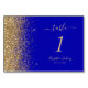 Det moderna bordsnumret bröllop i elegantens lämnat kant har en guld faux-utformning från glitter. Anpassadet kombinerar handskrift, rityta och kursivt typsnitt med blek guld färgad mot royalets blå bakgrund.