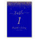 Det moderna bröllop-bordsnumret kant i denna elegant har en guld faux glitter-utformning. Anpassadet kombinerar handskrift, rityta och kursivt typsnitt med blek guld färgad mot royalets blå bakgrund.