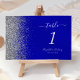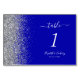 Det moderna bordsnumret bröllop i elegantens lämnat kant har en silver faux-utformning från glitter. Anpassadet kombinerar vit handskrift, tryckplåt och kursiv typsnitt på royalets blå bakgrund.