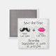 Ett modernt och trendig spara datum magneter med mustasch och läppar mot vit snöre.
