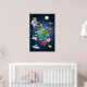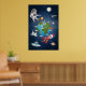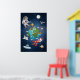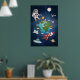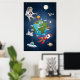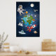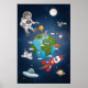 Det som händer runt jorden, en syn från rymden. Poster bild med raketer, astronaut, satellit, måne osv.