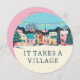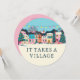 Kute pastellflickduschinbjudningar för vintertid med temat "Det tar en by". Unik design med runt form och rosa bakgrund. Anpassa baksidan med dina party-detaljer.