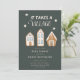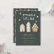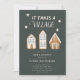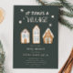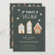 Rustiska och moderna julnöjesbabyduschar för en pojke med hand plockade som illustrerar gingerbrödhus med blå frostning. I texten står det "det tar en by".