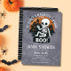 Den snygga könscellen Halloween-babyduschinbjudan med citatet "Det krävs en hemsökt by för att ta upp en liten boo!". Med ett vidsträckt baby-skelett med hus på baksidan och fladdermus över en grått-bakgrund med spindelnät, på baksidan har det en svart bakgrund med rand. Inbjudan anger tonen för en roligt och höjer firande som hedrar mamma. Fullständigt anpassade med namn, datum, händelseinformation och osa. Underbar för familjer som planerar en festiv pojke- eller flickbash i oktober.