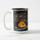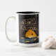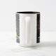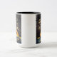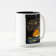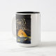 Tvåtonsfärgad mugg (plocka på färg) med en vattenfärgad bild på båda sidor om mugg: En båt på stormiga hav, under fullt måne med ord: "Livet kryper eller ökar i proportion till modet", citat.
