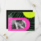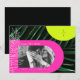 Neon rosa och gult samlas över mörk handflatan löv med lodrät monogram på högsta högerna och vit kontur handflatan löv på lämnat. Anpassa den vita texten och fotot.