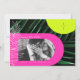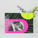 Neon rosa och gult samlas över mörk handflatan löv med lodrät monogram på högsta högerna och vit kontur handflatan löv på lämnat. Anpassa den vita texten och fotot.