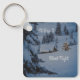 Den här designen visar ett foto av ett hytt i skogen på snö på natten. Denna fredliga och fredliga scen fångar hur vinter och jul kunde ha varit. Den gröna träd i närheten av huset är prydad med julen ljus som förberedelse för Jultomten besök.