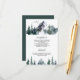 Elegant skogstema bröllopsbiljett med vacker bergsutsikt och tallar på vit bakgrund.