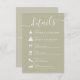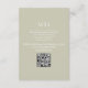 Detta enkla detaljerade schemat för inklusionskort med bröllopsinformation med en skannbar QR-kod och enkelt schema, med en Sagegrön stil, minimalistisk, kalligrafisk stil, med mottagningsinformation och ett elegant monogram på baksidan.