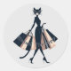 En moderiktig, antropomorfisk katt framställs med flera shopping bag, med frasen "Detaljhandelsbehandling" skriven på en av påsarna. Kattdjuret är påklädt och bär solglasögon, vilket utesluter en sofistikerad luft.