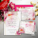 Kortet bröllop - Modern text passar bra in i det vackra, vita guld-kantade-ram som visar den underliggande fantastiska, ljusa fuchsiska scarlet, blommor som är utkanta i guld - originalteckningar © av WhimsicalArtwork™.