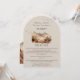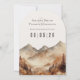 Akvarellandskapsmålning av träd, flygande fåglar och berg i bakgrunden. Jordnära färger av en höst med en vacker naturillustration. Se till att dina gäster får all information om din speciella dag med detta välvda detalj-kort.