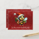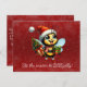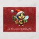 En söt lycklig-bin som håller presenter i det är vingar, på en röd snöflingerbakgrund. "Det här är säsongen till BEE jolly" text på framsidan med julmeddelandet på baksidan, som också är en röd snöbakgrund.