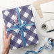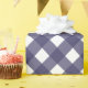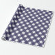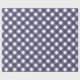 Sofistikerade pappra inslagningsfunktioner har blå och vita diamanter i ett fet diagonalt buffel. Den mörk blått och vita gingham mönster var designad från början.