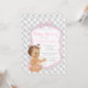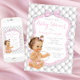 Diamanter och pärlor baby shower-inbjudan med söt litet barn som bär rosa rufflade byxor och pärlhalsband på en vacker diamantmönstrad bakgrund med vacker silver- och rosa rosett. Denna söta rosa och grå diamant- och pärlbaby shower-inbjudan kan enkelt anpassas för ditt evenemang genom att helt enkelt lägga till dina uppgifter i den typsnittsstil och formulering du väljer. Detta är en tryckt design utan riktiga diamanter, pärlor, tufting, glitter etc.