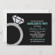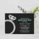 Lyxiga bröllopsinbjudningar för möhippa med en glänsande silver diamant förlovningsring grafik mot en slank svart bakgrund med robin äggblå accenter. Den chic färgpaletten ger en snygg och sofistikerad vibe till er tjejers nattfirande. All text är helt anpassningsbar för att passa dina festdetaljer.