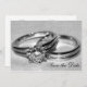 Meddela din kommande vigsel med den eleganta Diamond Bröllopsring Set Håll Datum-anmälan. Detta klassiska anpassade bröllop håll datum anmälningskort har en digitalt förbättrad närbildsfotografi av en diamantförlovningsring och bröllopsring set med en grå bakgrund.
