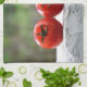 Drei rote Tomaten auf einer weißen Mauer vor grüner Natur