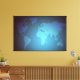 This modern world map design is formed from a grid of tiny square dots, creating a clean digital and pixel-inspired look. Blue gradient tones define the landmasses, while the glowing background transitions from deep warm hues to bright blue, adding depth and contrast. The centered composition and abstract style offer a contemporary interpretation of the global map, ideal for modern interiors, tech-inspired spaces, and fans of digital art aesthetics.