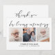 Detta kondoleansk tackkort erbjuder ett genomtänkt och respektfullt sätt för familjer att uttrycka tacksamhet till vänner, släktingar och nära och kära som visat sympati, stöd och vänlighet under en tid av sorg. Avsett för användning efter en begravning, minnesstund eller firande av livet, gör designen det möjligt för familjen att hedra minnet av den avlidne samtidigt som de erkänner den omsorg och medkänsla de fick. Framsidan av kortet har plats för tre foton, medan baksidan innehåller ditt tackmeddelande (lämna det tomt om du hellre vill skriva ett meddelande för hand). Den rena, moderna layouten är återhållsam och värdig, vilket gör den lämplig för män eller kvinnor i alla åldrar och för både traditionella och moderna ceremonier. Detta tackkort finns tillgängligt antingen som professionellt tryckta gratulationskort eller som en direkt digital nedladdning, beroende på vilket alternativ som väljs före kassan. Det digitala alternativet är idealiskt för familjer som behöver omedelbar åtkomst eller föredrar att skriva ut korten själva, medan det tryckta alternativet ger högkvalitativa kort som levereras färdiga att skicka eller dela ut. Oavsett om det används för att tacka deltagare, vårdgivare eller de som skickat blommor, måltider eller kondoleansmeddelanden, ger detta
