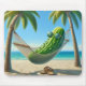 En stor grönt i en hammock som hänger mellan två tropiska handflatan träd på en strand med flip-flops.
